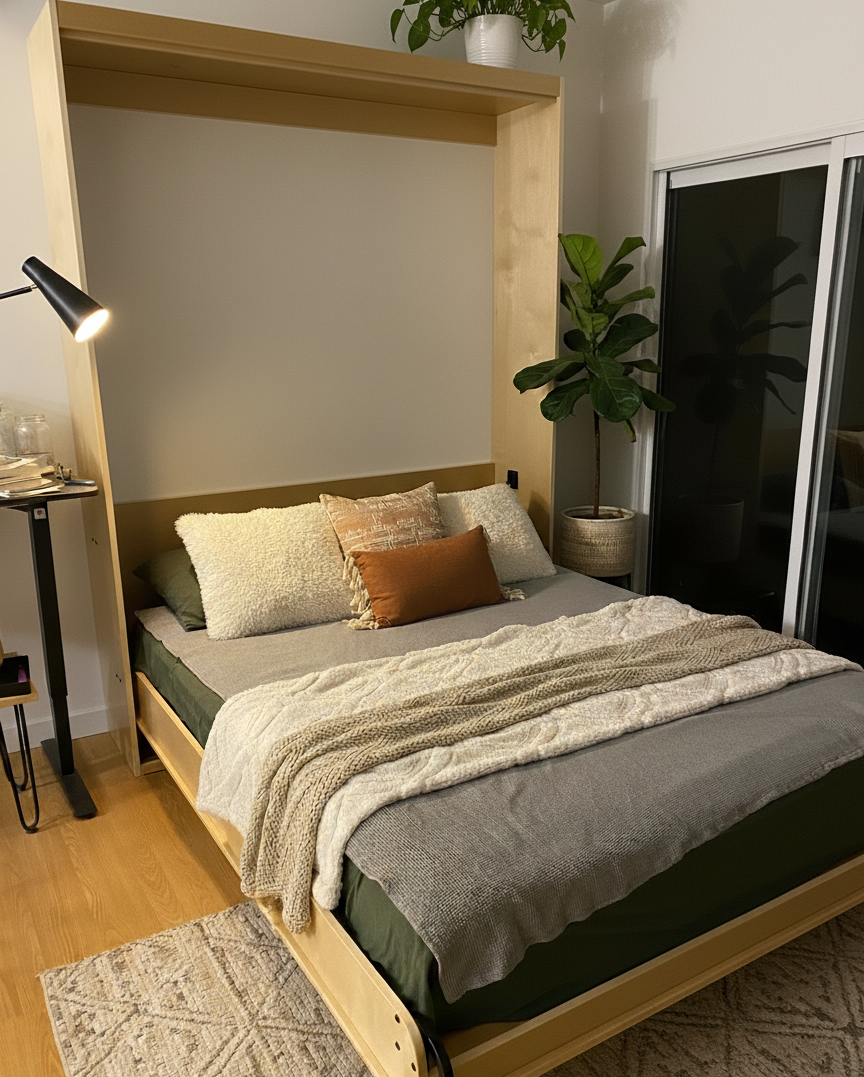 We do this through well-designed furniture that serves multiple uses or stores away easily. Take a Murphy bed, for example. When folded into the wall, it transforms a small bedroom into a full office—with no compromise to either function. That's the kind of smart design that makes small spaces live large.